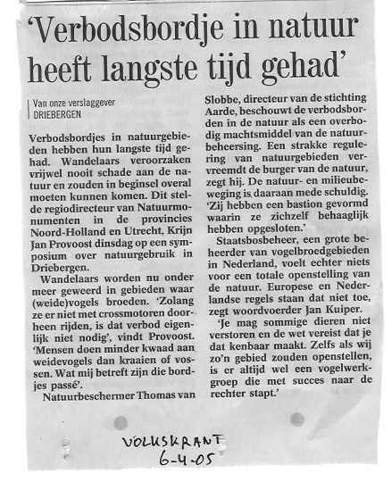 alleen op de wereld. Alle gekheid op een stokje: een alles overkoepelende Wandelwet werkt niet, hoe graag we dat als wandelaars ook zouden willen. En een Wandelwet zit er hier niet in. PS: wat ik miste in de weergave van mijn reactie was de tweede helft van mijn artikel uit Te Voet - die plak ik voor de volledigheid hieronder: Sectarisme leidt nergens toe De boer op. Af en toe de poot stijf houden Zeker, af en toe moet de poot stijf gehouden worden: als bestaande onverharde voetpaden afgesloten of in hun bestaand bedreigd worden, de kerke- en jaagpaden van weleer, zoals vastgelegd in de Wegenlegger en beschermd door de Wegenwet. Er is al zo weinig over gebleven: de wegenlegger heeft in veel gemeenten bijna niets meer te bieden, na al die asfalteringen, onttrekkingen en ruilverkavelingen sinds de Tweede Wereldoorlog! Als overleg niets oplevert dan proberen we het met actiewandelingen, processen, stampij en ‘vrije publiciteit’. Helemaal mee eens. Maar het scheppen van nieuwe wandelpassages door boerenland, natuurreservaten en landgoederen, da’s andere koek. Dat kan alleen maar op basis van vrijwilligheid gebeuren. Net als het ontsluiten van bestaande landschapselementen voor de wandelaar - zoals grasdijken, uiterwaarden, afgedankte spoorbanen en dergelijke. Dan moet je gaan praten met de eigenaren en pachters, dan moet je met hun belangen en opvattingen rekening houden, dan moet je iets te bieden hebben (geld om vergoedingen voor ‘recreatief medegebruik’ uit te betalen!), dan moet je soms accepteren dat het vanwege de ligging van weidevogelnesten niet linksom kan maar wel rechtsom. Draagvlak zoeken, de boer op gaan, de gemeente- en provinciehuizen langs, de recreatieschappen in , op mars door de instituties. Uitleggen waarom een wandelaar best wel op een geasfalteerd fietspad kan lopen maar toch een eigen onverhard voetpad prefereert: exclusiviteit! Uitleggen waarom er in een aantal kavels natuurontwikkeling best plaats is voor een ruig voetpad, als er tussen de wandelaars en de Noordse woelmuis en de kikker maar een moerassige of struikenrijke tussenzone gemaakt wordt. Een werk van lange adem, het handen- en voetenwerk in de regio dat lang niet altijd resultaat oplevert. Missiewerk onder de heidenen, soms ja. In ieder geval: wandelaars zijn minder vrij dan Nemo denkt. Wandelaars hebben met anderen rekening te houden, Wandelwet of geen Wandelwet. Overal rondstruinen is uit den boze, een algemeen ‘zwerfrecht’ is niet van deze wereld. Overpad dient verkregen te worden: het is geen universeel natuurrecht voor de wandelaar. Reactie van Nemo, Peter Spruijt, 9-11-2004 Als wij de stijl van de actie en de polemiek hanteren, wil dat niet zeggen dat we uit zijn op 'wandel-extremisme'. We zijn geen hekvernietigende draadknippers die boeren omver lopen (zoals Vladimir ons graag wil zien). Als je onze site en teksten leest, zie je dat we uit zijn op dialoog en redelijke oplossingen. Heb je ooit een anarchist (wandel)wetten zien eisen? Het doel van onze (bewuste) overtredingen is het bereiken van de 'zenuwknoop' waarom een pad of een bepaald gebied is afgesloten. De eerste hekken en bordjes zijn vaak onterecht of juridisch niet duidelijk. Het probleem wordt pas duidelijk als je doorloopt. Als een eigenaar of een bevoegd gezag beveelt ons te verwijderen, doen we dat ook (volgens WvS art. 460 en 461) . Tenzij zo'n bevel onterecht is en we een bekeuring of aanhouding willen uitlokken. In de meeste gevallen kunnen we zonder problemen doorlopen. We proberen altijd uit te vinden waarom die 'zenuwknoop' er zit. Bijvoorbeeld na de eerste actiewandeling zijn we op bezoek geweest bij Johan Stuart van Landschap Noord-Holland en toevallig belde vandaag het Recreatieschap voor een afspraak. We stemmen onze acties en informatie af op de provinciale wandeloverleggen en jullie Meldpunt Wandelen. Alle informatie, achtergronden en reacties publiceren we op internet ( www.voetpaden.nl ). Ik vind het nog altijd ongelooflijk jammer dat er binnen het Wandelplatform geen ruimte was voor andere stijlen van lobbyen, dan de doffe 'parlementaire stijl' van voorzitter Loos. Daarom zijn we uit het platform gestapt, omdat het debat zo benauwend en vernauwend was. Keerpunt voor ons was het botte veto van de ANWB in het Wandelplatform-bestuur tegen deelname aan de campagne van Milieudefensie "Trek de groene grens". Directe aanleiding was de weigering van vereniging Te Voet om met ons een sterke zelfstandige belangenvereniging (zoals de Ramblers) op te zetten. Zij wilden geen fusie en kozen voor een vleugellamme associatie met het Wandelplatform. Natuurlijk hadden we onze huidige campagne liever in het kader van het platform georganiseerd, in aansluiting op ons gezamenlijk project re-vitalisering Wegenwet en eerdere projecten (Voet bij stuk e.d.). Maar het platform is een andere weg ingeslagen, en hield het debat af door heikele punten in de doofpot te stoppen. Een wandelwet had geen prioriteit meer. Natuurlijk lokt onze campagne reacties en verzet uit. Nederland is een braaf land, en het poldermodel bestaat bij de gratie van hekken en verbodsbordjes. Als je de openbaarheid (als het openbare publieke domein) wilt vergroten, kom je altijd in botsing met private belangen. En die private belangen gebruiken vaak geweld. De kern van onze acties is het willen vergroten en toegankelijk maken van het publieke domein. De paradox in Nederland is dat het publieke domein door de media en subsidies enorm vergroot is, maar dat vrije toegankelijkheid omgekeerd evenredig verdwenen is. Daarvan zijn wandelaars direct de dupe, nog afgezien van natuur/landschapswaarden die finaal vernield worden. Dat Vladimir zo rancuneus reageert is veelzeggend, daar zit een geschiedenis achter en een persoonlijke achtergrond. Wat ik wil aantonen is dat al die reacties illustratief zijn voor de onmacht van de wandelwereld in Nederland om effectief op te komen voor wandelbelangen. Iedereen heeft eigen belangen als (law)routemaker, uitgever, wandelinstituut, 